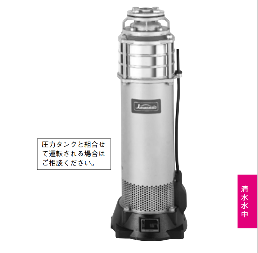 | 發(fā)動機 | 屏蔽潛水電機 三相200V(55kW為400V) 同步 轉速 50Hz:3,000min-1,60Hz:3,600min-1  |
